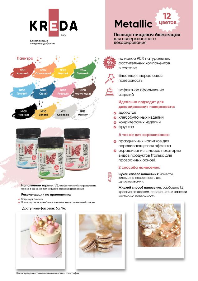 Линейка сухих блестящих пищевых красителей (12 цветов) является идеальным инструментом для декорирования поверхности кондитерских изделий из мастики, марципана, шоколада, конфет, фруктов, ягод и др. с целью создания блестящего эффекта. Специальная формула обеспечивает легкое и удобное нанесение на поверхность, а 10 блестящих цветов позволяют на изделиях расставлять яркие эффектные акценты. Жемчужная пыльца также популярна как добавка в газированные напитки для создания перламутрового эффекта.