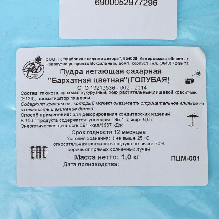 Сахарная пудра голубого цвета нетающая, с ароматом ванили. Пышная и рассыпчатая сахарная пудра, ложится на изделие бархатным слоем, что позволяет при минимальном её количестве хорошо задекорировать любую поверхность изделий.